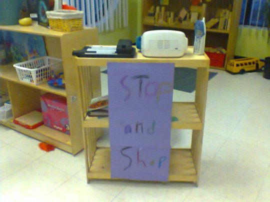 The kids made the sign and the pretend money. We also added an old credit card machine and some change for the toy cash register. The objective for the store is to teach the children how to count money, how to use a credit card, how to answer the store phone and how to greet customers.