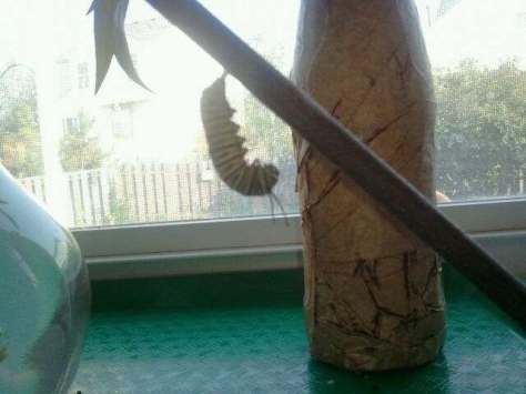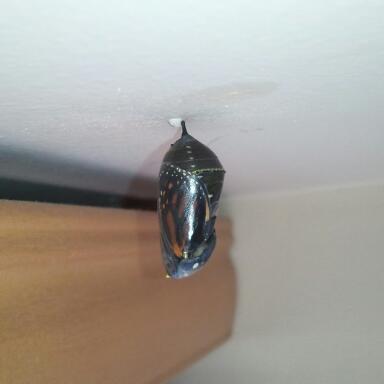 The last pic is of a chrysalis that was on the ceiling. The caterpillars wander around til they find their place. And once they have attached their button you have to let them finish out where they are or it will kill them to move it.”