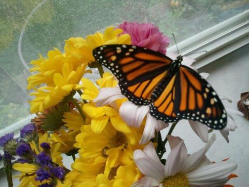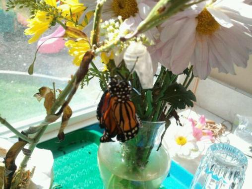 “Oh my butterflies – how inspirational this little project has been! Short story – took a garden with kids class, a friend brought milkweed and the rest is history. I planted milkweed about 4 years ago and finally found monarch caterpillars this past summer. We hatched 6 over all – 1 male, 5 females. The last one died coming out of its chrysalis. We pick a stem off and bring them in the house to watch. They eat and eat and eat!! and they poop. a lot. They are in the kitchen window by the sink so dish washing is a lot more enjoyable! These are random pictures from last year.